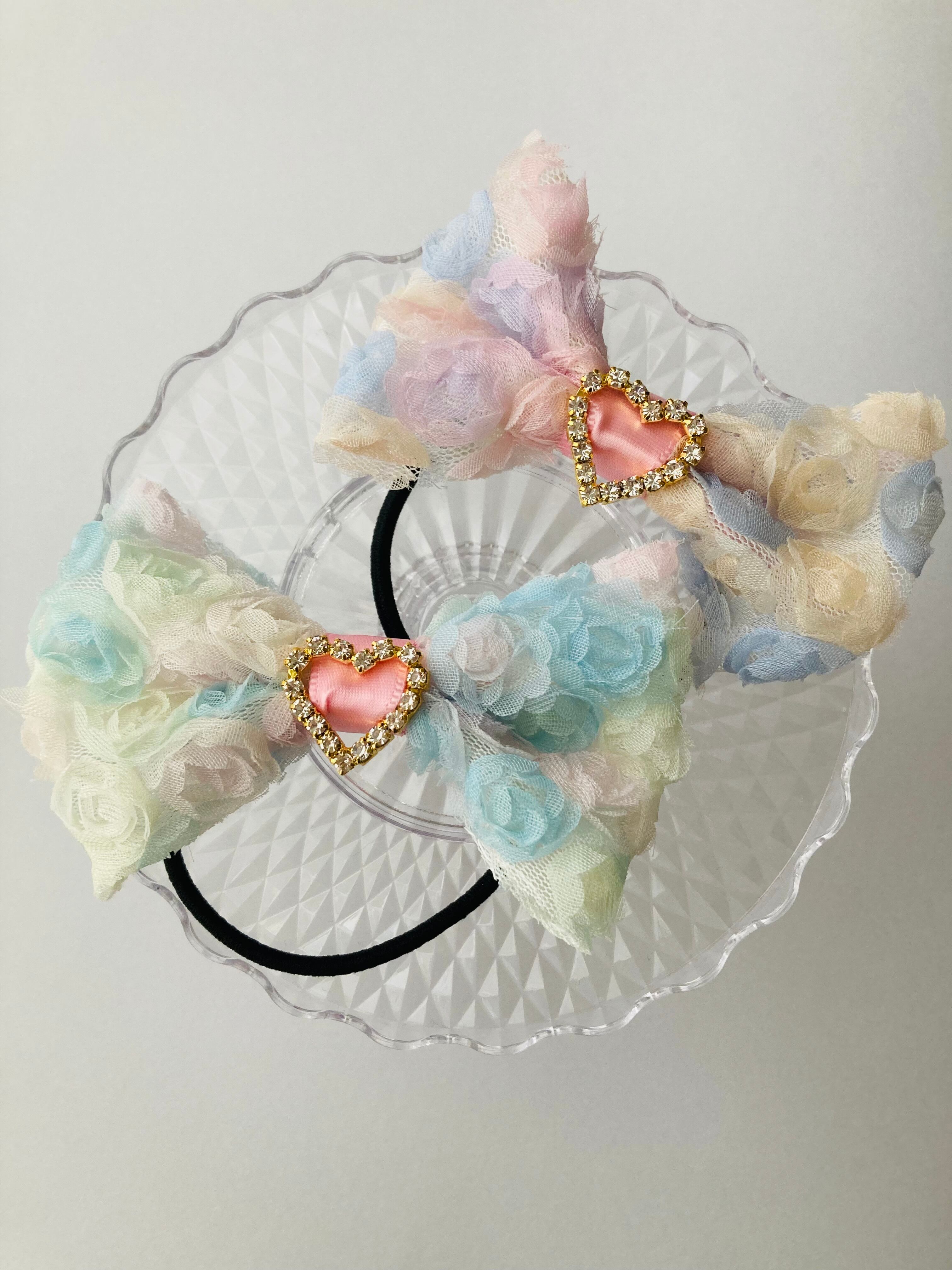 淡いカラーのふわふわフラワーチュールを使用した可愛いヘアゴムです。